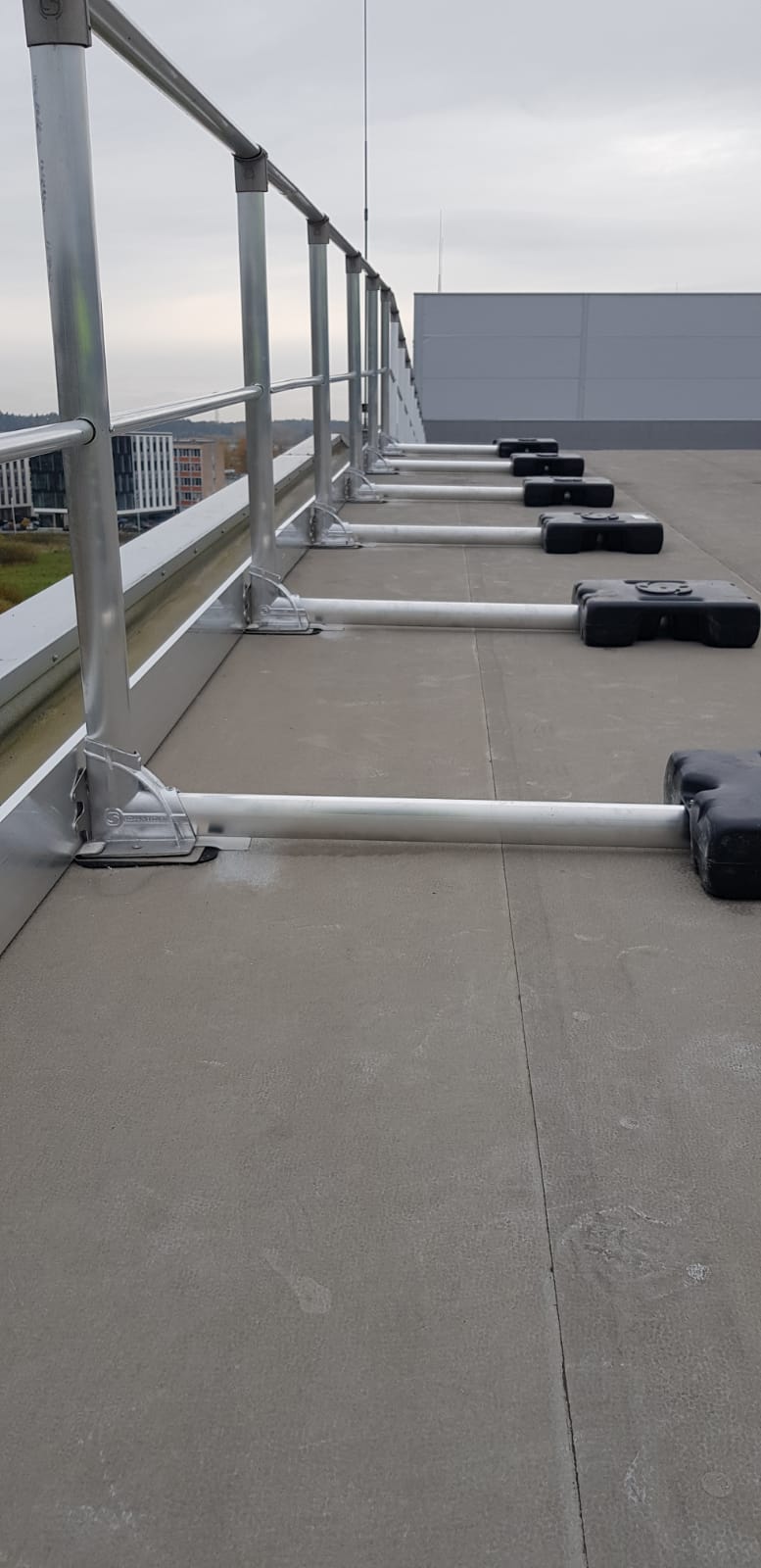 Bardzo popularnym systemem asekuracji na dachach o stosunkowo niskim stopniu nachylenia są balustrady zabezpieczające. Zastosowanie takiego rozwiązania jest bardzo korzystne, ponieważ producenci oferują coraz częściej systemy, które działają na zasadzie przeciwwagi, przez co nie ma konieczności ingerencji warstwy dachowe, co wpływa pozytywnie na trwałość pokrycia dachowego. Jest to szczególnie korzystne w na przykład w przypadku dachów zielonych lub dachów odwróconych które w swoich warstwach wierzchnich przewidziane mają materiały, które mogą stanowić balast dla zainstalowanych barier asekuracyjnych. Jest to również rozwiązanie estetyczne, zatem pełni funkcję zabezpieczającą, nie działając przy tym niekorzystnie na wygląd budynku.